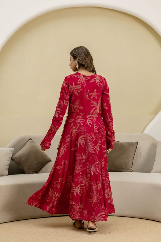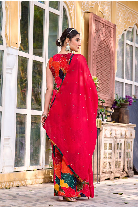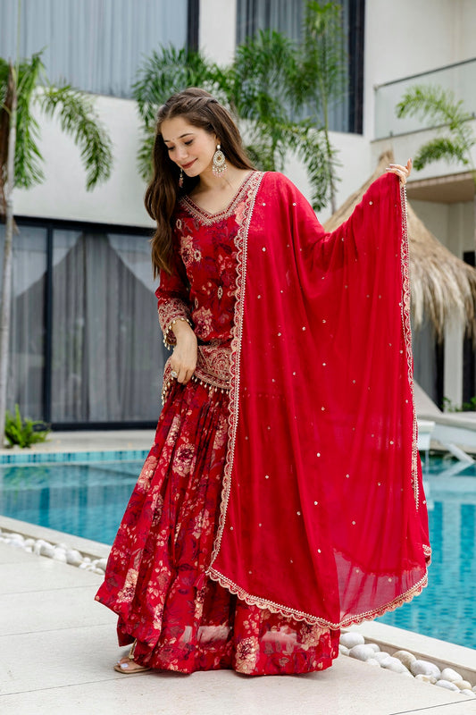 Red Chinon Kurti Skirt 3 Pieces Set