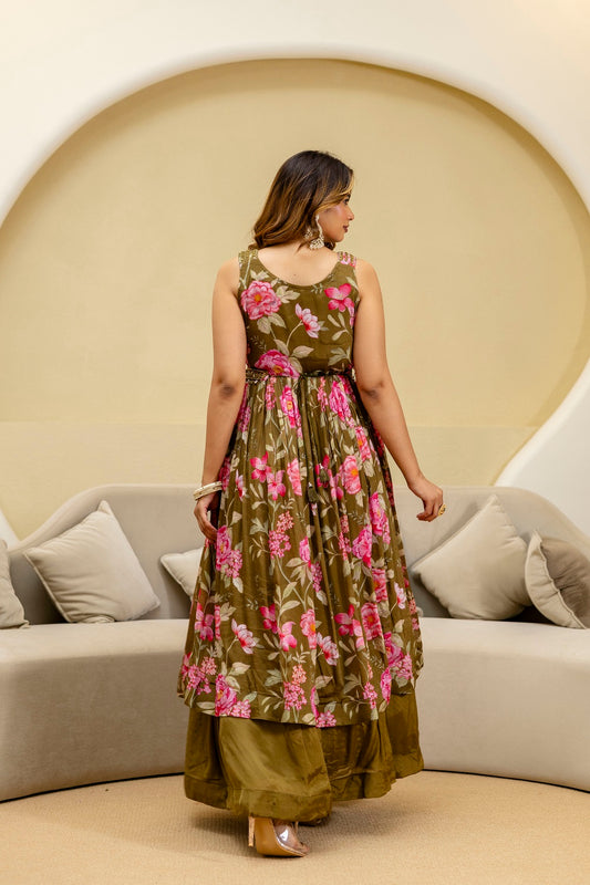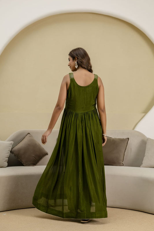Mehandi Green Chinon Frock Kurti 3 Pieces Set