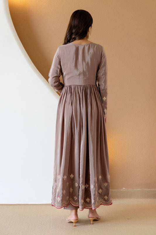 Brown Crepe Frock Kurti 3 Pieces Set