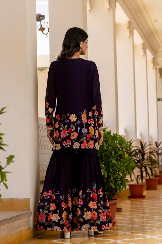 Dark Violet Chinon Short Kurti 3 Pieces Set