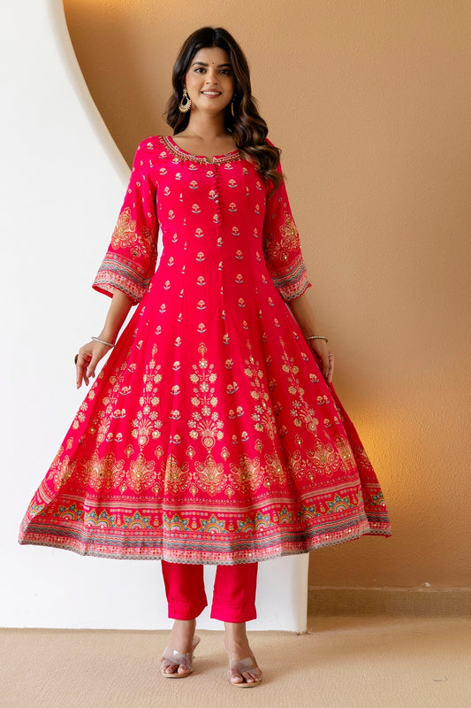 Reddish Pink Chinon Frock Kurti 3 Pieces Set