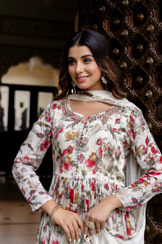 Cream Chinon Frock Kurti 3 Pieces Set