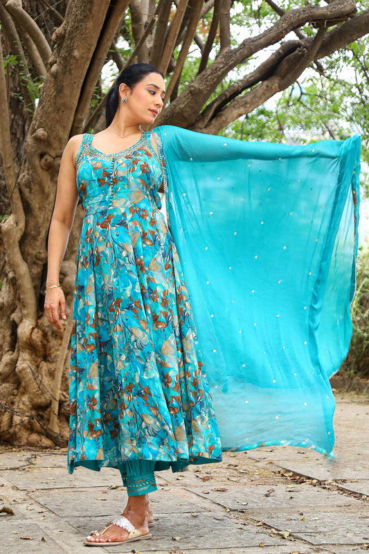 Rama Green Chinon Afghani Kurti 3 Pieces Set