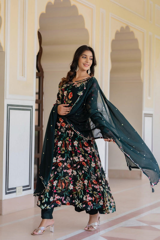 Bottle Green Chinon Frock Kurti 3 Pieces Set
