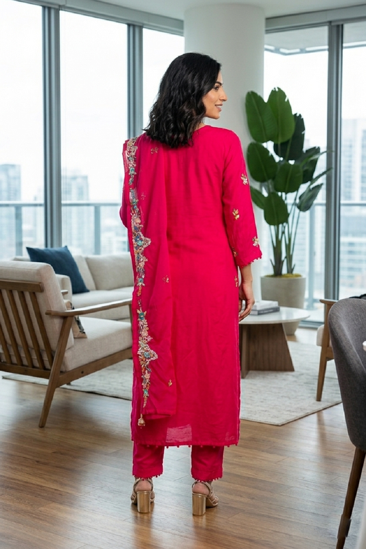 Rani Pink Silk Kurti Pant 3 Pieces Set