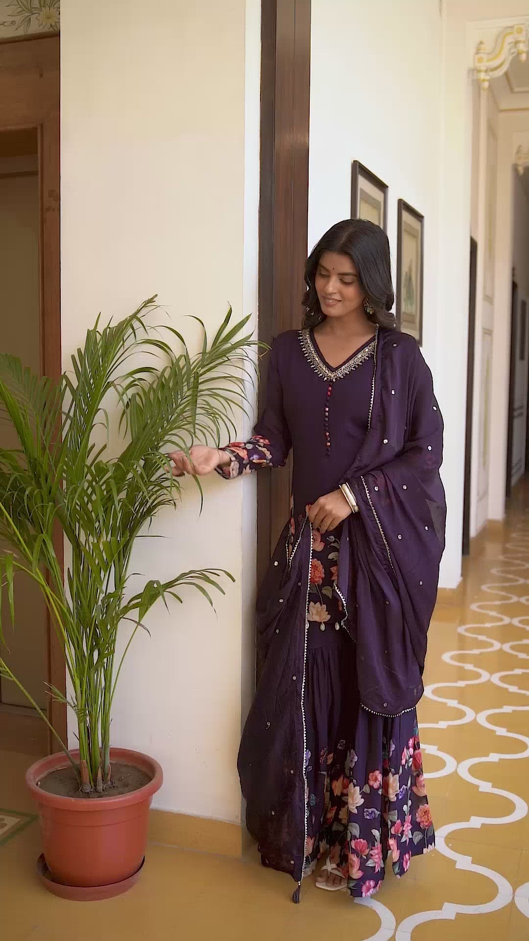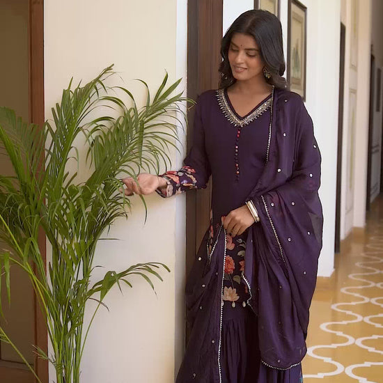 Dark Violet Partyqueen Short Kurti With Garara And Dupatta. This Pattern Is Made In Chinon Fabric. Handwork Pattern, V Neck Collar Type And 3/4 Sleeves Pattern.