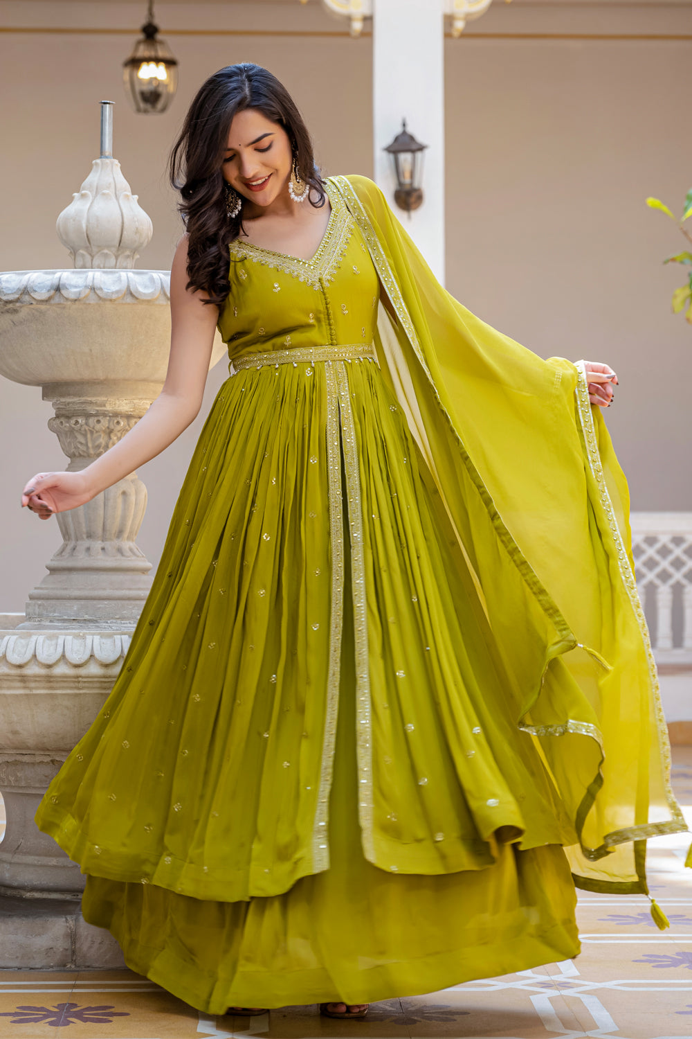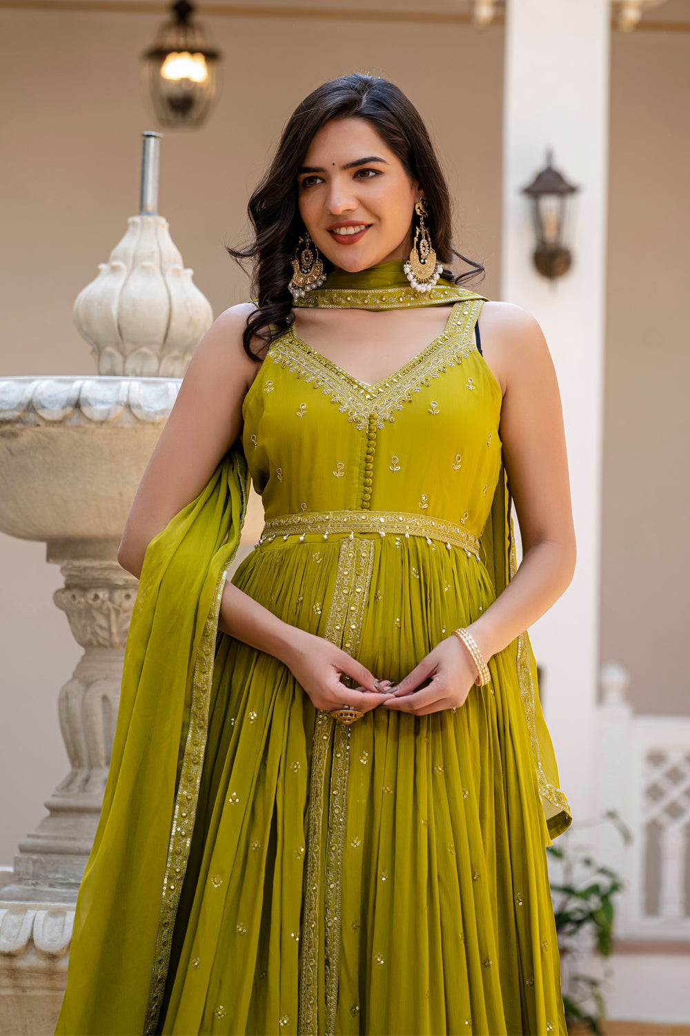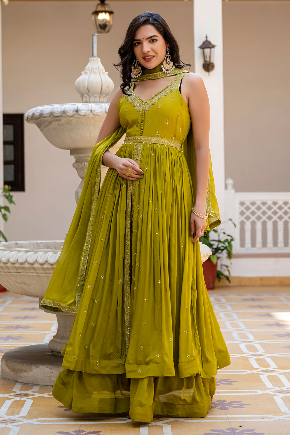 Kaira Partyqueen Green Open Skirt Kurti Dupatta Set . This Pattern Is Made In Chinon Fabric. Handwork Pattern, V Neck Collar Type And Sleeveless Strap Pattern.