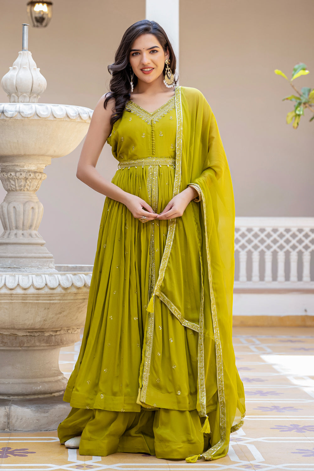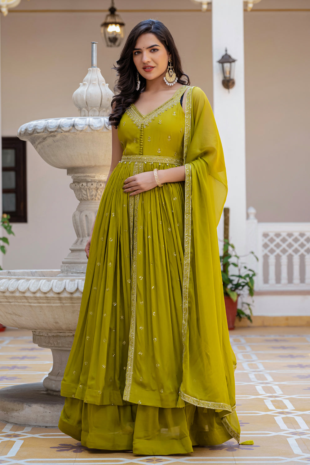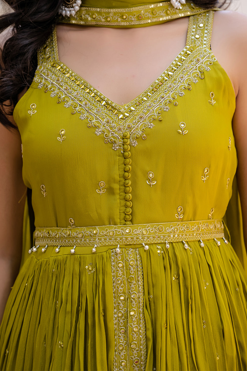 Kaira Partyqueen Green Open Skirt Kurti Dupatta Set . This Pattern Is Made In Chinon Fabric. Handwork Pattern, V Neck Collar Type And Sleeveless Strap Pattern.