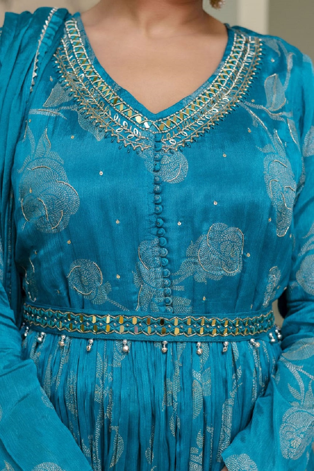 Rama Green Party Queen Chinon Long Kurti  With Pant And Dupatta Set. This Pattern Is Made By Chinon Fabric. Handwork Pattern And Round Neck Collar Type With Full Sleeves.