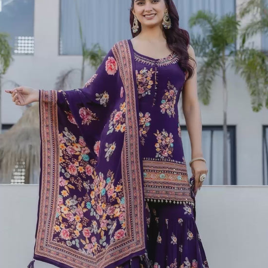 Violet Party Queen Crepe Kurti With Sharara And Dupatta Set. This Pattern Is Made By Crepe Fabric. Handwork Pattern And V-Neck Collar Type With 3/4 Sleeveless Pattern.